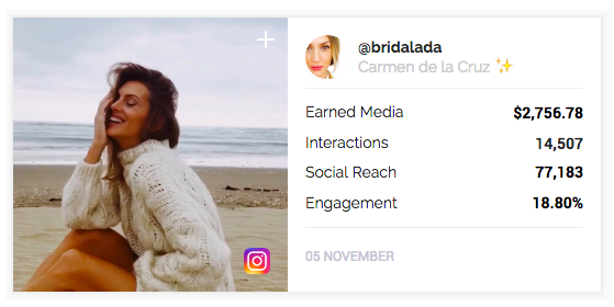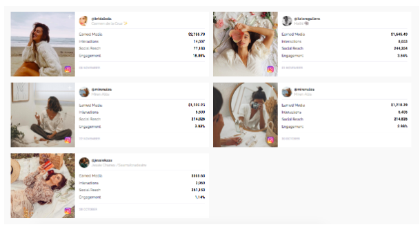 Si analizamos el conjunto de 5 posts de las influencers para esta campaña, comprobamos que han obtenido más de 8 mil dólares de Earned Media, se han alcanzado a 1 millón de cuentas potenciales y han conseguido casi un 4% de engagement.
