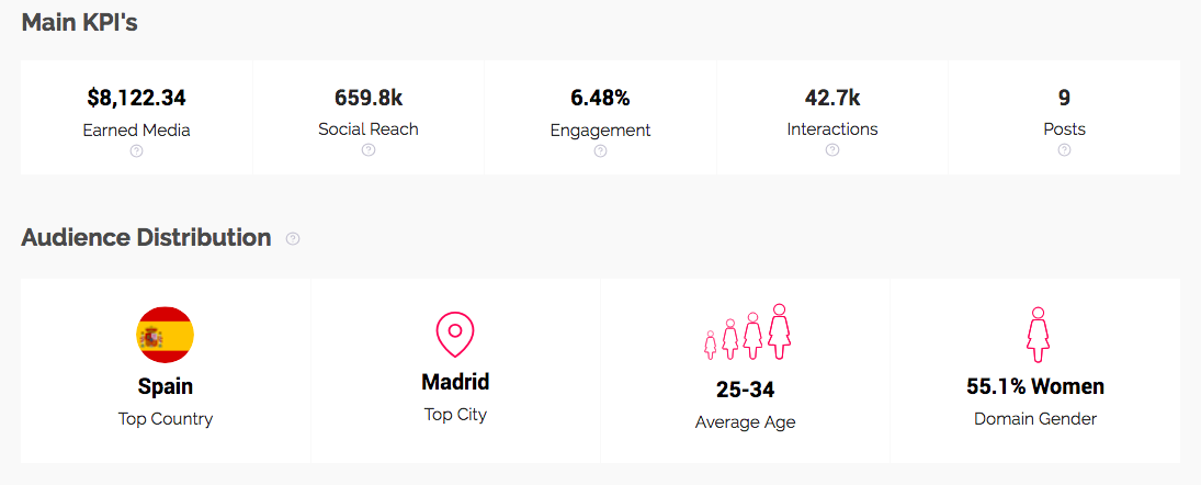 Los KPI’s más destacados de esta campaña que hemos podido analizar gracias al software de Influencity, la campaña está alcanzando más de 8,000.00$ y más de un 6% de engagement . Por lo que, por el momento, la campaña está siendo todo un éxito.