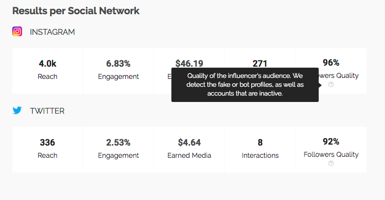 Follower Quality: this metric specifies the quality of an influencer’s public, taking into account the number of bots or inactive profiles that follow them.