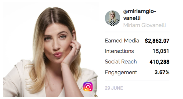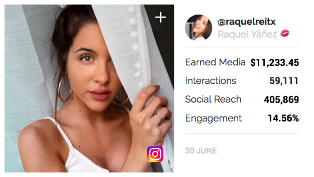 On the 30th of June, she uploaded two photos demonstrating the results before and after using the product, so that her audience could see just how well the product works. Her post achieved more than $11,000.45 Earned Media, almost 60,000 interactions and a total engagement rate of 14.56%.