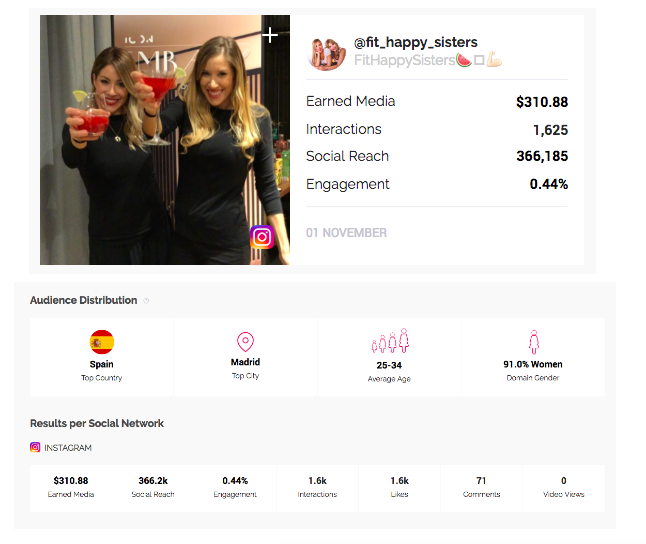 Resultados ofrecidos por el software de Influencity del perfil @fit_happy_sisters
