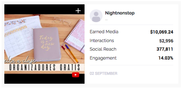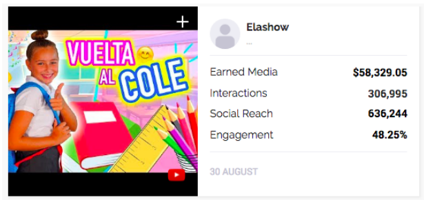 En primer lugar, ponemos de ejemplo a Elashow, de la Familia Carameluchi. Analizando su cuenta de YouTube podemos demostrar que sus datos son increíbles: más del 57% de engagement, y casi 37.000$ de Earned Media.