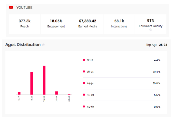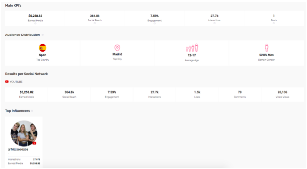 Resultados ofrecidos por el software de Influencity de la cuenta de YouTube de Elaia.