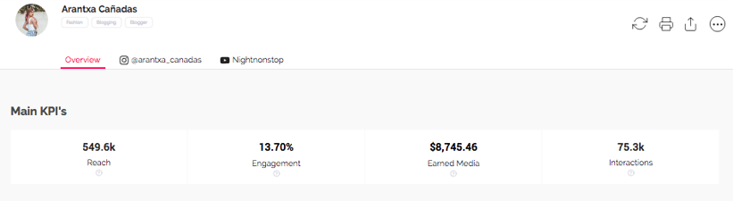 Resultados ofrecidos por el software de Influencity de la cuenta de YouTube y el perfil de Arantxa Cañadas.