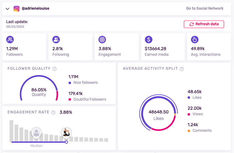 The quality of an influencer’s audience helps you determine if they are as good as they say they are. The calculation takes into account a number of aspects, including engagement rates, follower activities, and profile information (i.e., if the profile has a real name or a handle with a random string of numbers and letters) . You can see this metric and others when you analyze an influencer’s profile with an influencer marketing platform.